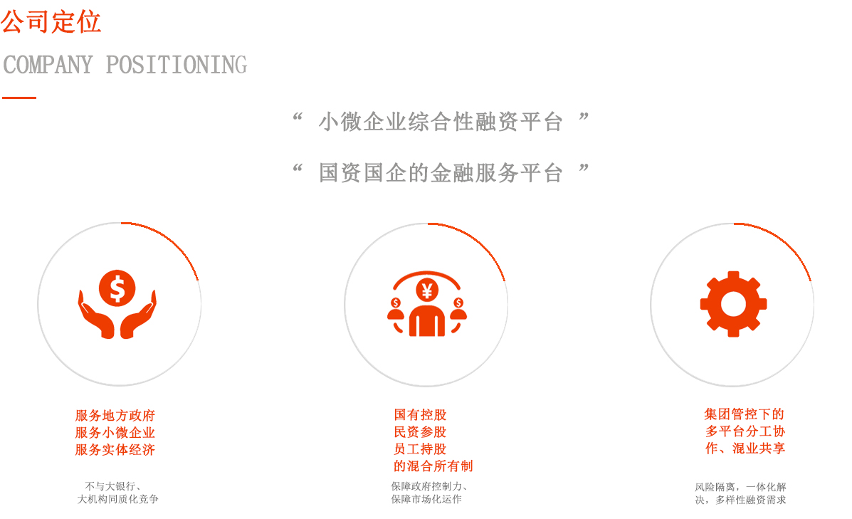 堅持“服務(wù)地方政府、服務(wù)小微企業(yè)、服務(wù)實體經(jīng)濟”的方向, 不與大銀行、大機構(gòu)同質(zhì)化競爭;通過國有控股(相對)、民資 參股、員工持股的混合所有制,心懷小微,頭戴紅帽,走市場化 道路;通過集團管控下的多平臺分工協(xié)作、混業(yè)共享,實現(xiàn)風(fēng)險 隔離,一體化解決中小企業(yè)多樣性融資需求。