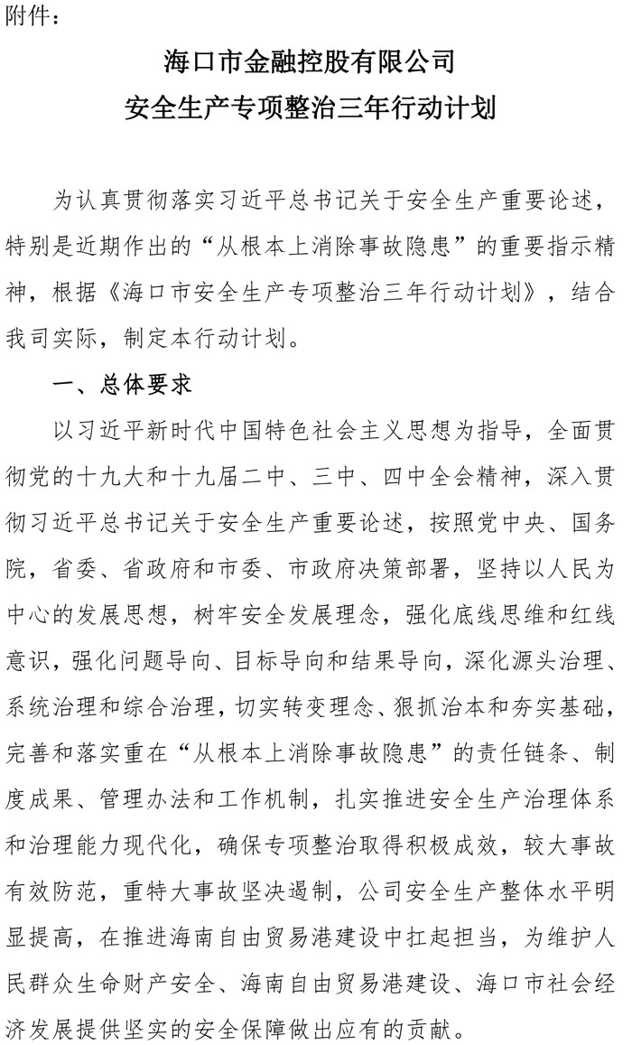 海口市金融控股有限公司關(guān)于印發(fā)《安全生產(chǎn)專項(xiàng)整治三年行動(dòng)計(jì)劃》的通知